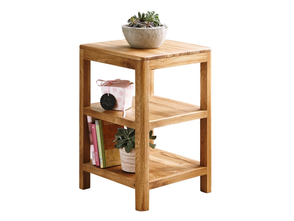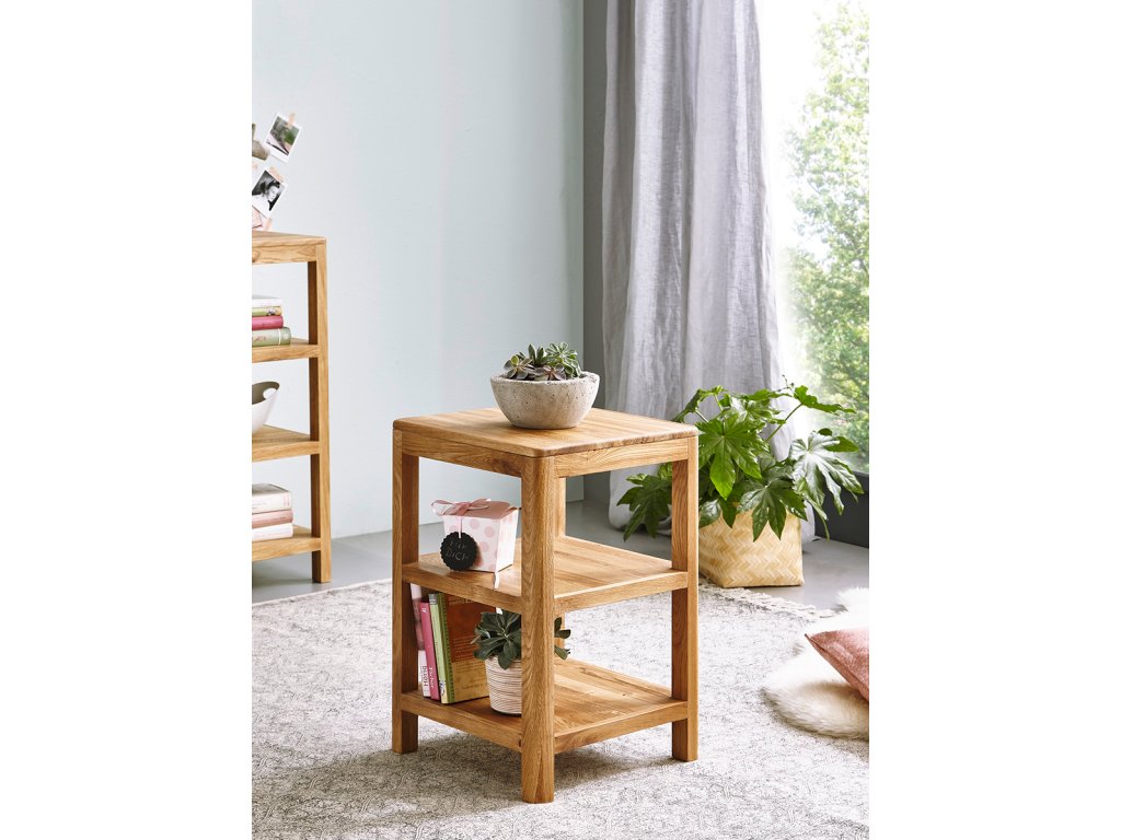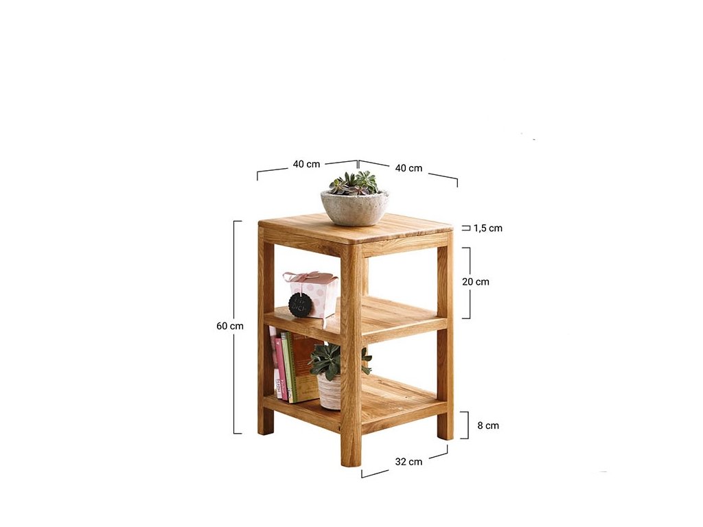 Stylový a praktický odkládací policový stolek Gialo - malý z masivního dubu — ideální doplněk do obývacího pokoje, předsíně nebo ložnice. Kombinuje robustní konstrukci s elegantním přírodním dekorem, nabízí úložný prostor na knihy, dekorace či drobné předměty a zvýrazní teplý, nadčasový vzhled interiéru.