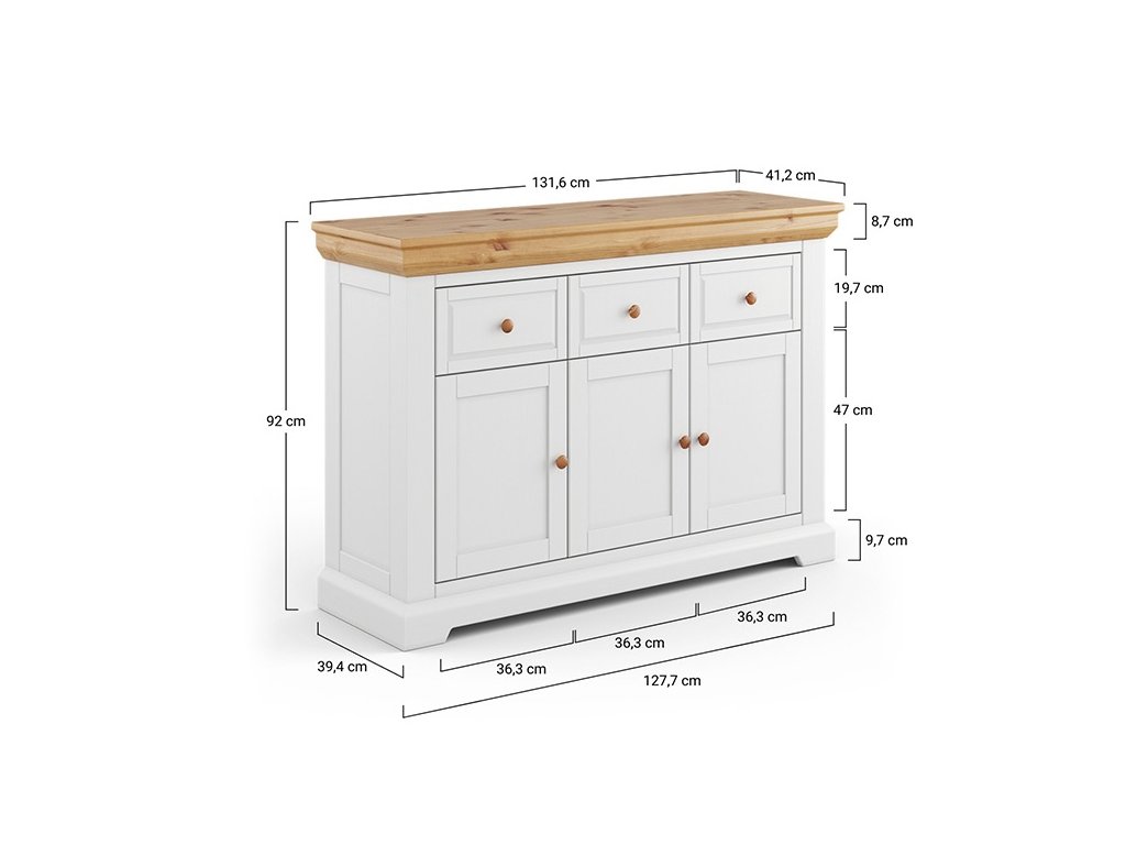 Komoda Marone Elite 3.3 o rozměrech 131x92x41 cm je dokonalou volbou pro ty, kteří hledají praktický úložný prostor s nádechem venkovského stylu. Je vybavena třemi prostornými zásuvkami a třemi dvířky, za kterými se nacházejí dvě police, jež umožňují přehledné uspořádání různých předmětů, ať už v obývacím pokoji, ložnici, nebo předsíni. Horní deska z přírodního dřeva s jemnou povrchovou úpravou krásně kontrastuje s bílým matným povrchem těla komody. Stylové dřevěné úchytky podtrhují její rustikální charakter a praktický design zároveň nabízí snadné otvírání.