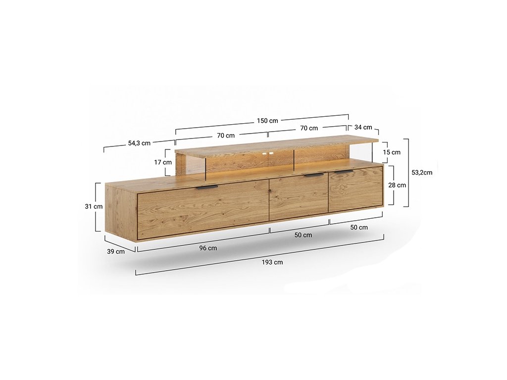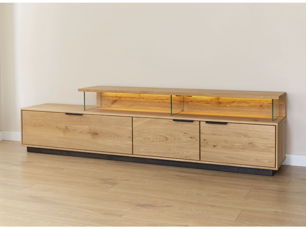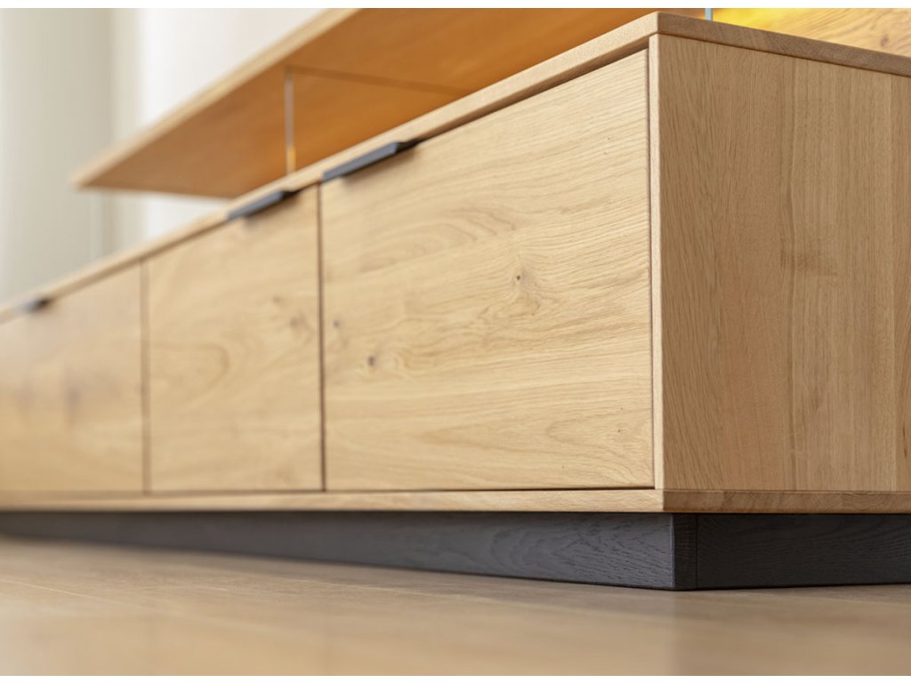 Tinnaro se dokonale přizpůsobí vašemu prostoru. Můžete ji postavit na podlahu, kde její černý sokl dodá stabilitu a vizuálně ji uzemní, nebo ji zavěsit na stěnu pro vzdušnější vzhled a snazší údržbu podlahy. Díky šířce 200 cm poskytuje dostatek prostoru nejen pro televizi, ale i pro další dekorace nebo audio techniku.