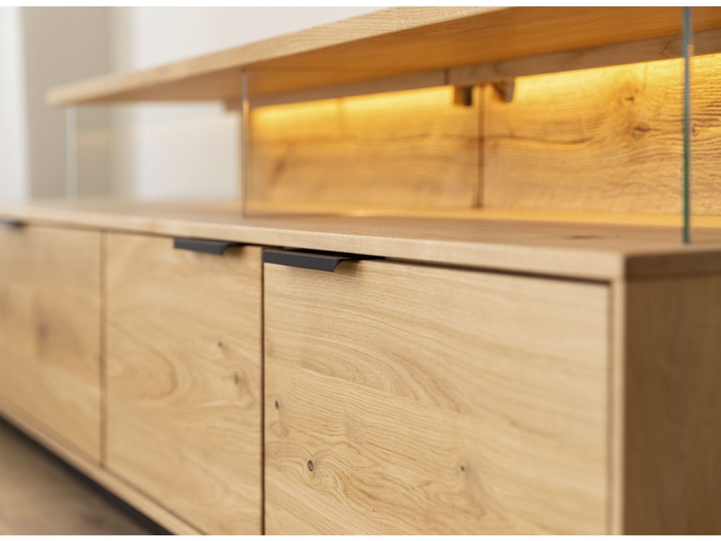 Zaujme vás hned. Ne proto, že by se snažila být extravagantní, ale díky kombinaci kvalitního masivu, precizního zpracování a promyšlených detailů. Dubové dřevo v přírodním tónu vyniká svojí kresbou, kterou podtrhuje povrchová úprava olejem s voskem. Komoda je dostatečně robustní, ale přesto nepůsobí těžce. Její vrchní police je totiž elegantně podepřená skleněnými bočnicemi, což dodává celému designu lehkost.