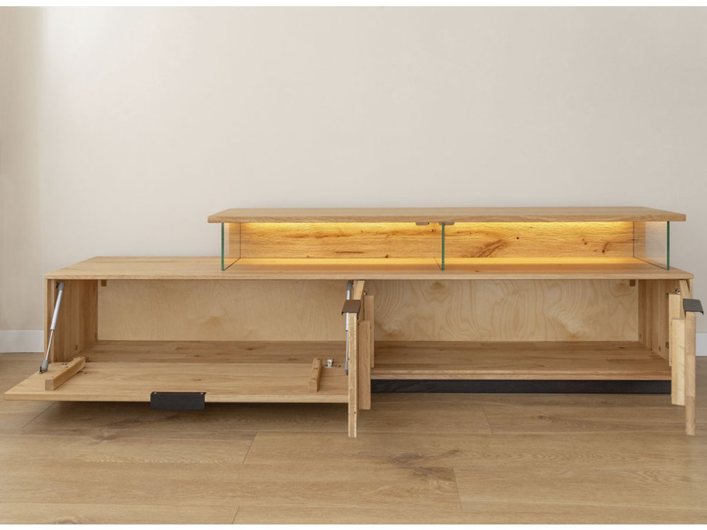 Nejde jen o úložný prostor. Večer, když se v místnosti setmí, se naplno projeví kouzlo vestavěného LED osvětlení. Jemné podsvícení vytvoří útulnou atmosféru, která promění obyčejné sledování filmu v zážitek. Tlumené světlo zvýrazní kresbu dřeva a odraz ve skle dodá místnosti elegantní šmrnc. Ať už si vychutnáváte oblíbený seriál, nebo jen relaxujete s knihou, s Tinnarem bude váš interiér vždy působit harmonicky a příjemně.