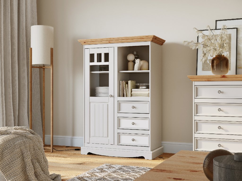 Trochu jako z pokojíčku pro panenky. Přesně tak na nás působí tahle roztomilá vitrína. Výškově stojí někde mezi šatní skříní a klasickou komodou. A to z ní činí zajímavý kus nábytku. Hodí se úplně všude. Bez nadsázky. Má prosklenou část, otevřené police, uzavíratelnou skříňku i šuplíky. A na vrchní desku, díky její výšce 130 cm, ještě pohodlně umístíte květiny, košíky nebo další dekorace.