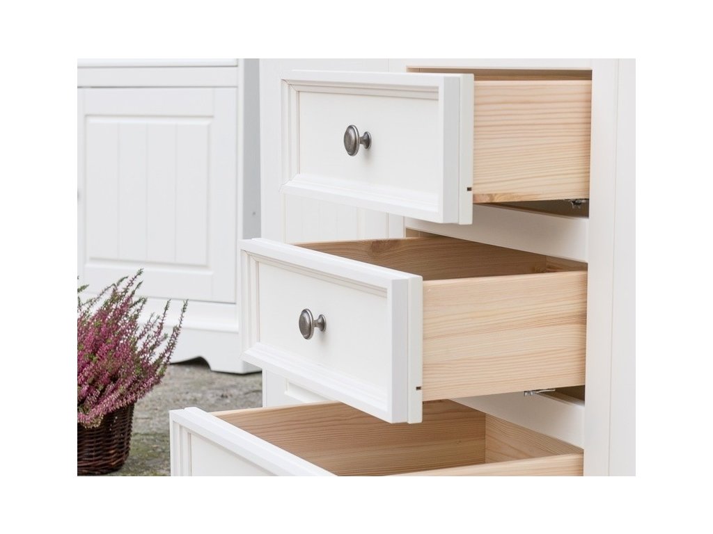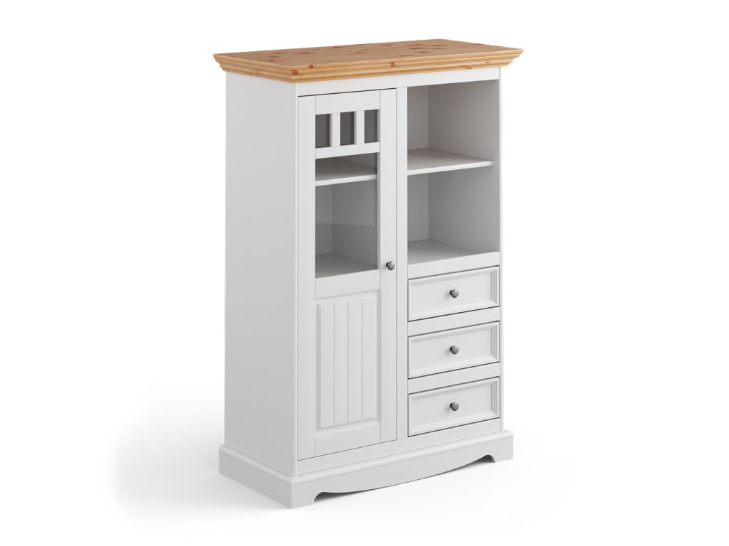 Skleněná vitrína pro vystavení věcí, které by měly být chráněny před prachem a rozbitím. Otevřené police pro knihy a vlastně cokoliv, co může být vystaveno. Takže především pro ty krásné věci, na které se chcete neustále dívat a připomínat si je. Uzavíratelný prostor skříňky pro uskladnění čehokoliv, co má být schováno. A nakonec tři roztomilé šuplíky s efektně frézovanou přední stranou a tichými kolejničkami. Takhle nějak vypadá univerzalita užitného designu. Oblečená ve slušivém bílém venkovském kabátku romantického vzezření.