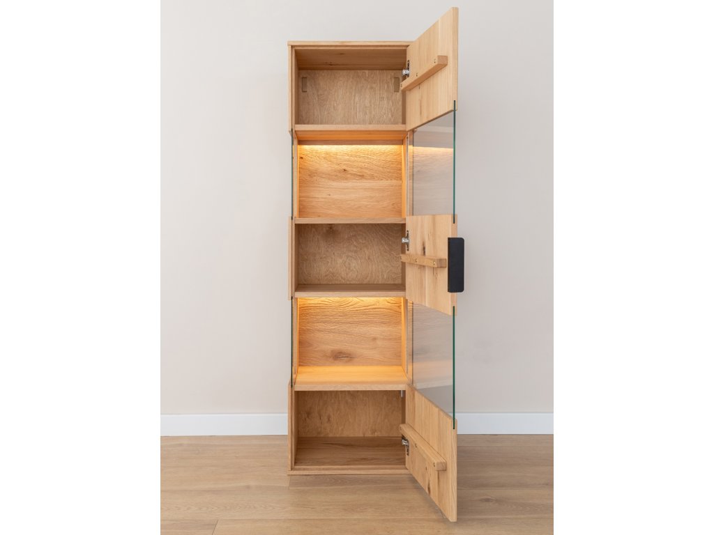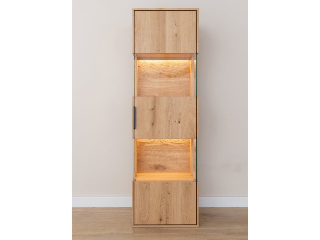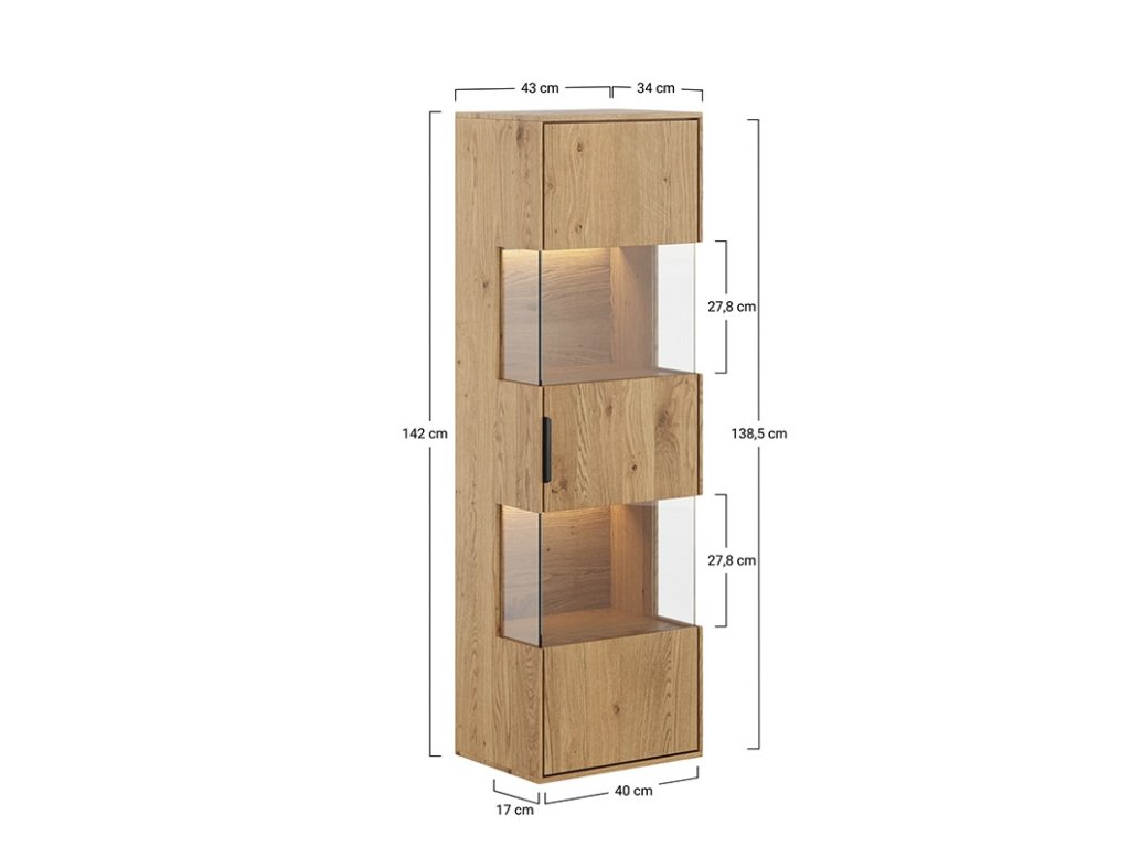 Vitrína má šířku 43 cm a výšku 142 cm nabízí vitrína prakticky rozvržený úložný prostor. Čtyři police skryté za prosklenými dvířky jsou ideální pro vystavení oblíbených dekorací nebo knih, zatímco uzavřené přihrádky poskytují místo na věci, které chcete mít po ruce, ale ne na očích. Vestavěné LED osvětlení navíc dodává vystaveným předmětům jemný akcent a umocňuje atmosféru místnosti.