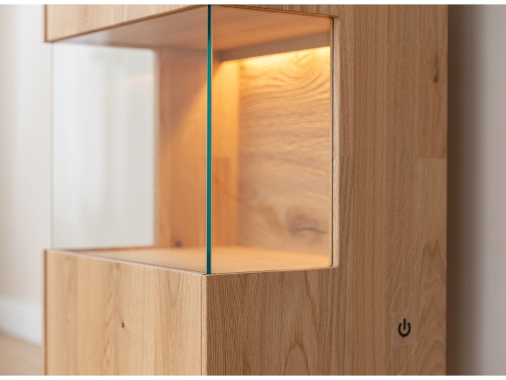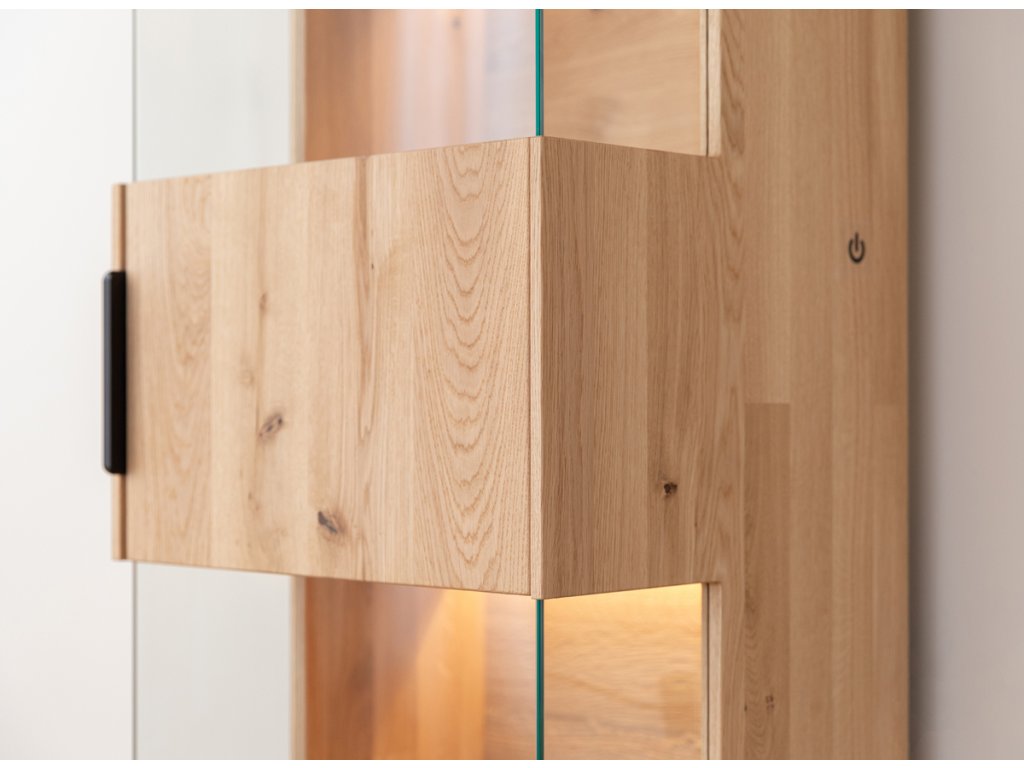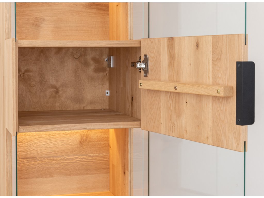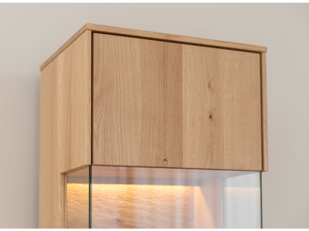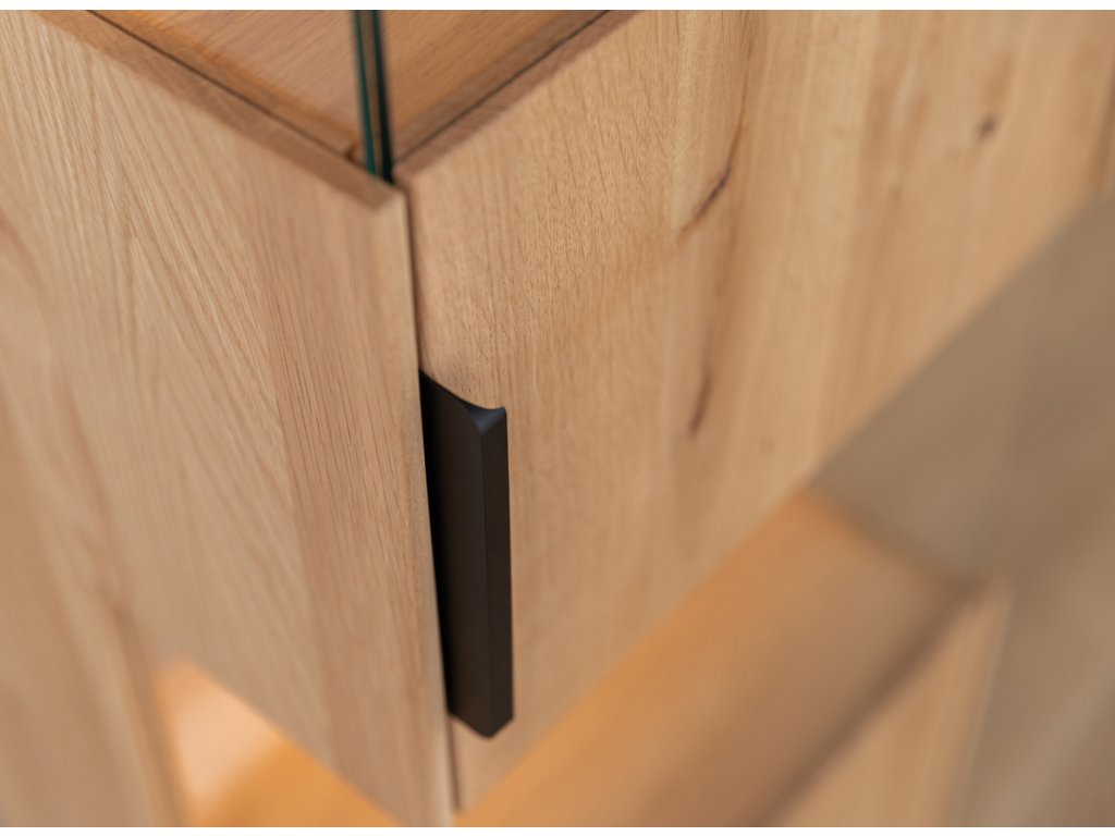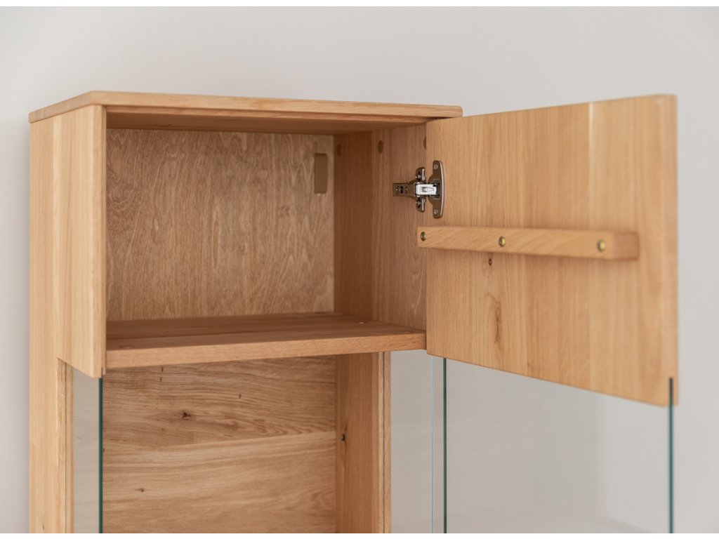 Masivní dub v přírodním provedení dává vitríně charakter a jedinečnost. Povrchová úprava olejem s voskem zvýrazňuje přirozenou kresbu dřeva a chrání jej před opotřebením. Skleněné boky vizuálně odlehčují konstrukci a dodávají vitríně eleganci. Dvířka jsou precizně zapuštěna do korpusu, čímž vzniká plynulý a kompaktní vzhled bez rušivých prvků. Jednoduše tato vitrína má množství malých, ale pečlivě promyšlených detailů, která vás budou bavit.