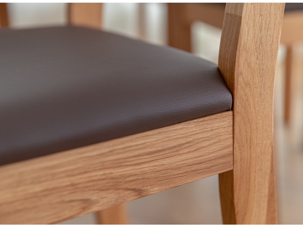 Medový odstín masivního dubového dřeva v kombinaci s tmavě hnědým podsedákem z ekologické kůže působí decentně a hodí se do většiny interiérů. Tmavě hnědá barva podsedáku podtrhuje přirozenou krásu dřeva a vytváří útulnou atmosféru, která se snoubí s tradičními i moderními interiéry. V této židli se budete cítit jako v křesle, zároveň se z ní ale snadno vstává, proto ji můžeme doporučit i dětem, nebo těžším osobám.