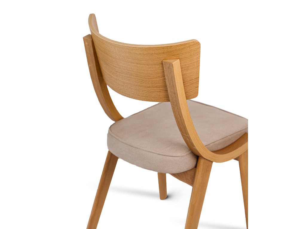 Na první pohled působí jednoduše, ale jakmile si sednete, pochopíte, že Diran je výjimečná. Její konstrukce z masivního dubového dřeva je pevná, odolná a zároveň výtvarně čistá. Zadní nohy se zvedají do oblouku, který s přesností nese samostatně usazenou opěrku zad. Tento detail není jen vizuálně zajímavý. Dodává židli charakter a nadhled.